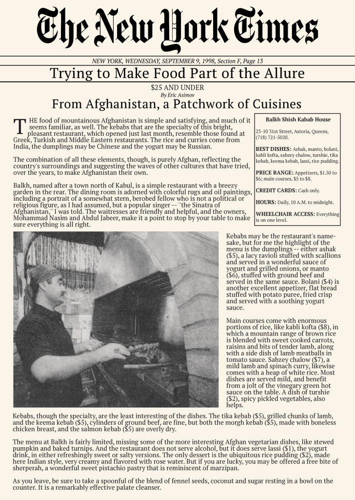 Named after the historic town of Balkh, north of Kabul, our restaurant was founded with the goal of bringing authentic Afghan cuisine to the heart of New York. Since opening our doors, we’ve been proud to offer a dining experience that reflects the warmth and hospitality of Afghanistan. Our founders, Mohammad Nasim and Abdul Jabeer, personally ensure that each guest is treated to a meal that delights the senses and showcases the best of our culture.