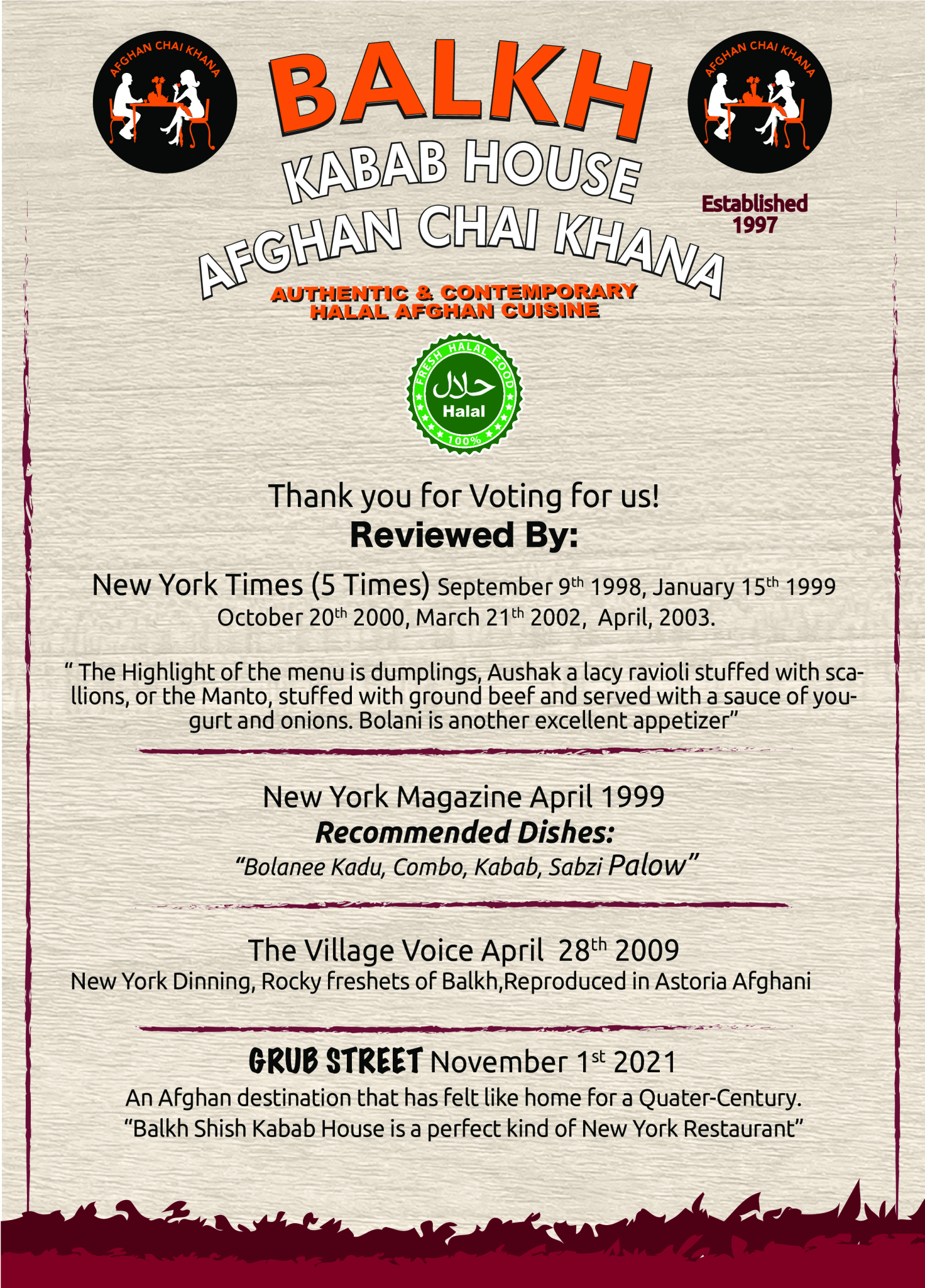 We look forward to welcoming you to Balkh Shish Kabab House and sharing our love for Afghan cuisine!